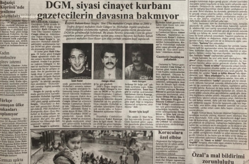 İçişleri Bakanı İsmet Sezgin, Yeni Ülke Muhabiri Cengiz Altun ve 2000’e Doğru Dergisi muhabiri Halit Güngen’in Hizbullah örgütü tarafından öldürüldüğünü söylemesine rağmen, öldürülen gazetecilerin davalarının DGM’de görülmediği belirlendi. Bu arada Cizre’de görev yaparken panzer görevlilerince açılan ateş sonucu hayatını kaybeden Sabah gazetesi muhabiri İzzet Kezer için olay yerinde keşif yapılacak.