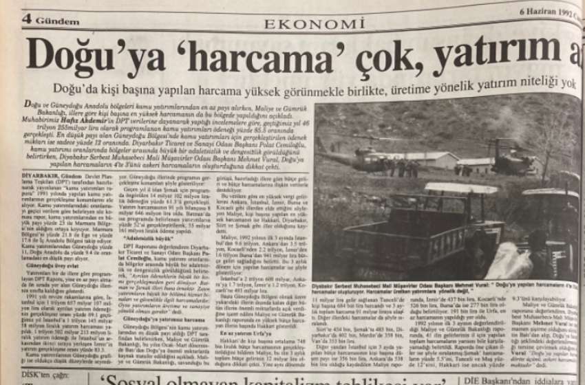 1992 yılının ilk 3 ayının değerlendirildiği Maliye ve Gümrük Bakanlığı raporunda, 41 ilin gelirlerinin il için yapılan toplam harcamaların yarısını bile karşılayamadığı belirtildi. Raporda öne çıkan iller ise şöyle sıralanmış, Şırnak harcamaların yüzde 5.5’ini, Tunceli ve Muş yüzde 12’sini Hakkari ise ancak yüzde 9.3’ünü karşılayabiliyor.