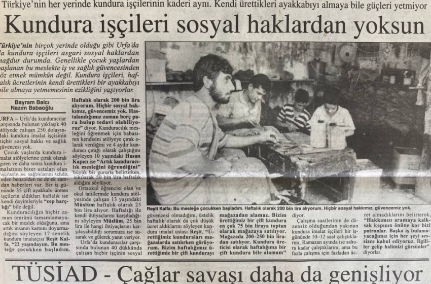 Türkiye’nin birçok yerinde olduğu gibi Urfa’da da kundura işçileri asgari sosyal haklardan mağdur durumda. Genellikle çocuk yaşlardan başlanan meslekte iş ve sağlık güvencesinden söz etmek mümkün değil. Kundura işçileri, haftalık ücretlerinin kendi ürettikleri bir ayakkabıyı bile almaya yetmemesinin ezikliğini yaşıyorlar.