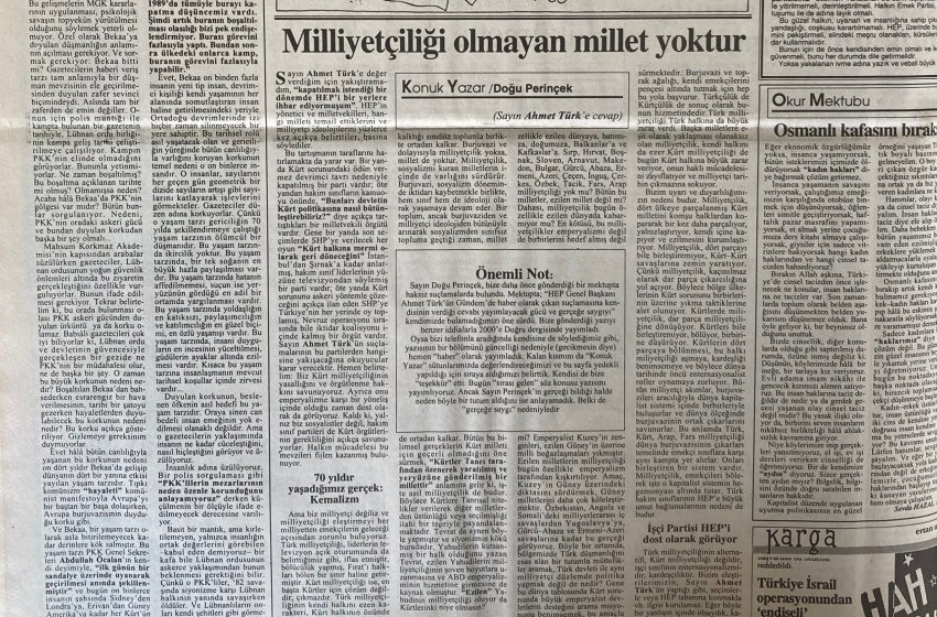 Sayın Doğu Perinçek, bize daha önce gönderdiği bir mektupta haksız suçlamalarda bulundu. Mektupta; “HEP Genel Başkanı Ahmet Türk’ün Gündem’de haber olarak çıkan suçlamasına kendisinin verdiği cevabı yayımlayacak gücü ve gerçeğe saygıyı” kendimizde bulamadığımızı öne sürdü. Bize gönderdiği yazıyı benzer iddialarla 2000’e Doğru dergisinde yayımladı. Oysa bizi telefonla aradığında kendisine de söylediğimiz gibi, yazısının bir bölümünü güncelliği nedeniyle (gecikmesin diye) hemen “haber” olarak yayımladık. Kalan kısmını da “Konuk Yazar” sütunlarımızda değerlendireceğimizi belirttik. Kendisi de bize “teşekkür” etti. Bugün “sırası gelen” söz konusu yazısını yayımlıyoruz. Ancak Sayın Perinçek’in gerçeği bildiği halde neden böyle bir tutum aldığını ise anlayamadık. Belki de “gerçeğe saygı” nedeniyledir.