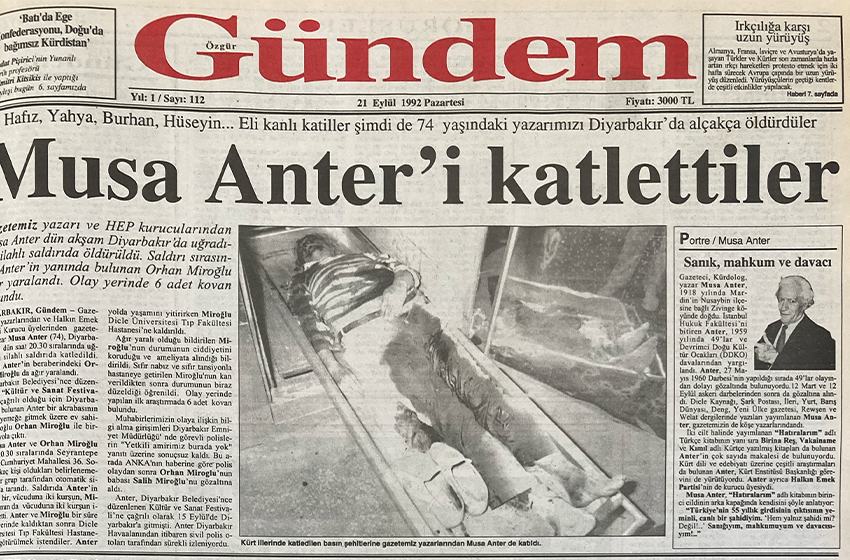 Gazetemiz yazarı ve HEP kurucularından Musa Anter, dün akşam Diyarbakır’da uğradığı silahlı saldırıda öldürüldü. Saldırı sırasında Anter’in yanında bulunan Orhan Miroğlu ağır yaralandı. Olay yerinde 6 adet kovan bulundu.