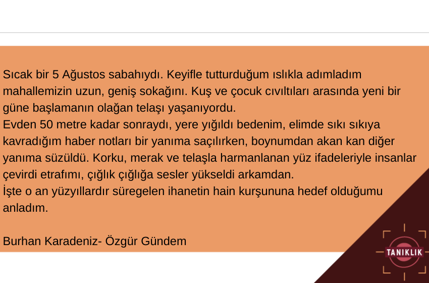 Sıcak bir 5 Ağustos sabahıydı. Keyifle tutturduğum ıslıkla adımladım mahallemizin uzun, geniş sokağını. Kuş ve çocuk cıvıltıları arasında yeni bir güne başlamanın olağan telaşı yaşanıyordu. Evden 50 metre kadar sonraydı, yere yığıldı bedenim, elimde sıkı sıkıya kavradığım haber notları bir yanıma saçılırken, boynumdan akan kan diğer yanıma süzüldü. Korku, merak ve telaşla harmanlanan yüz ifadeleriyle insanlar çevirdi etrafımı, çığlık çığlığa sesler yükseldi arkamdan. İşte o an yüzyıllardır süregelen ihanetin hain kurşununa hedef olduğumu anladım.